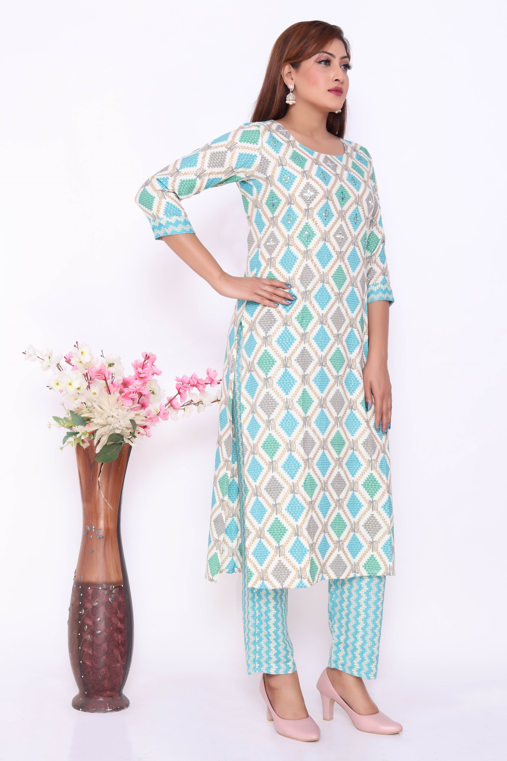 This vibrant aqua blue dress features a striking geometric print that exudes modern elegance and style. Made from high-quality fabric, this dress ensures both comfort and a flattering fit. The dress is designed with a classic silhouette and three-quarter sleeves, making it perfect for casual outings, festive gatherings, and parties. The outfit is completed with matching geometric print pants, creating a cohesive and fashionable look. This dress is ideal for those who appreciate bold patterns and contemporary fashion.