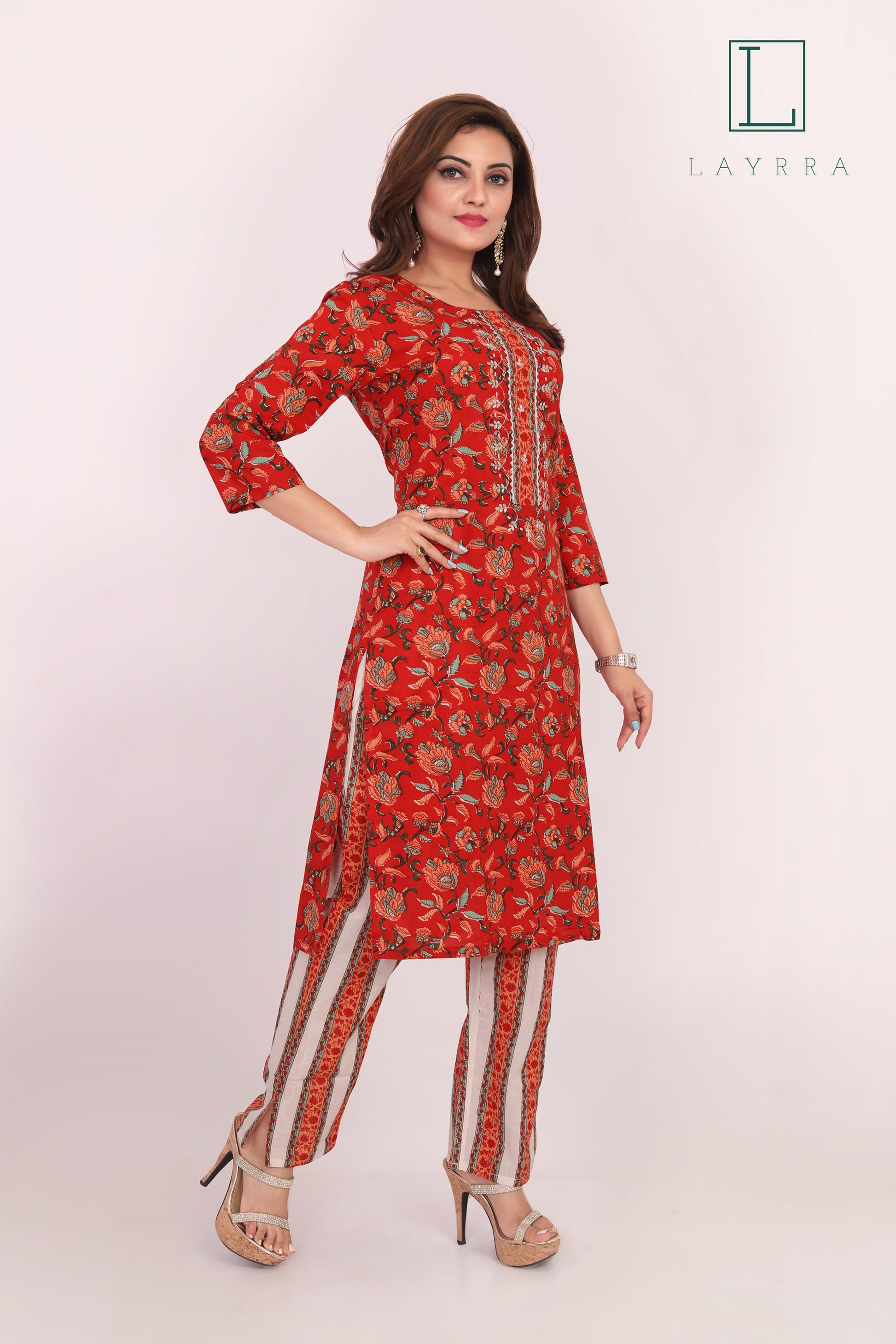"Women Red Orange and White Floral Print Embroidered Work Kurta with Pants & Dupatta - Complete Set , has a round neck, three-quarter sleeves