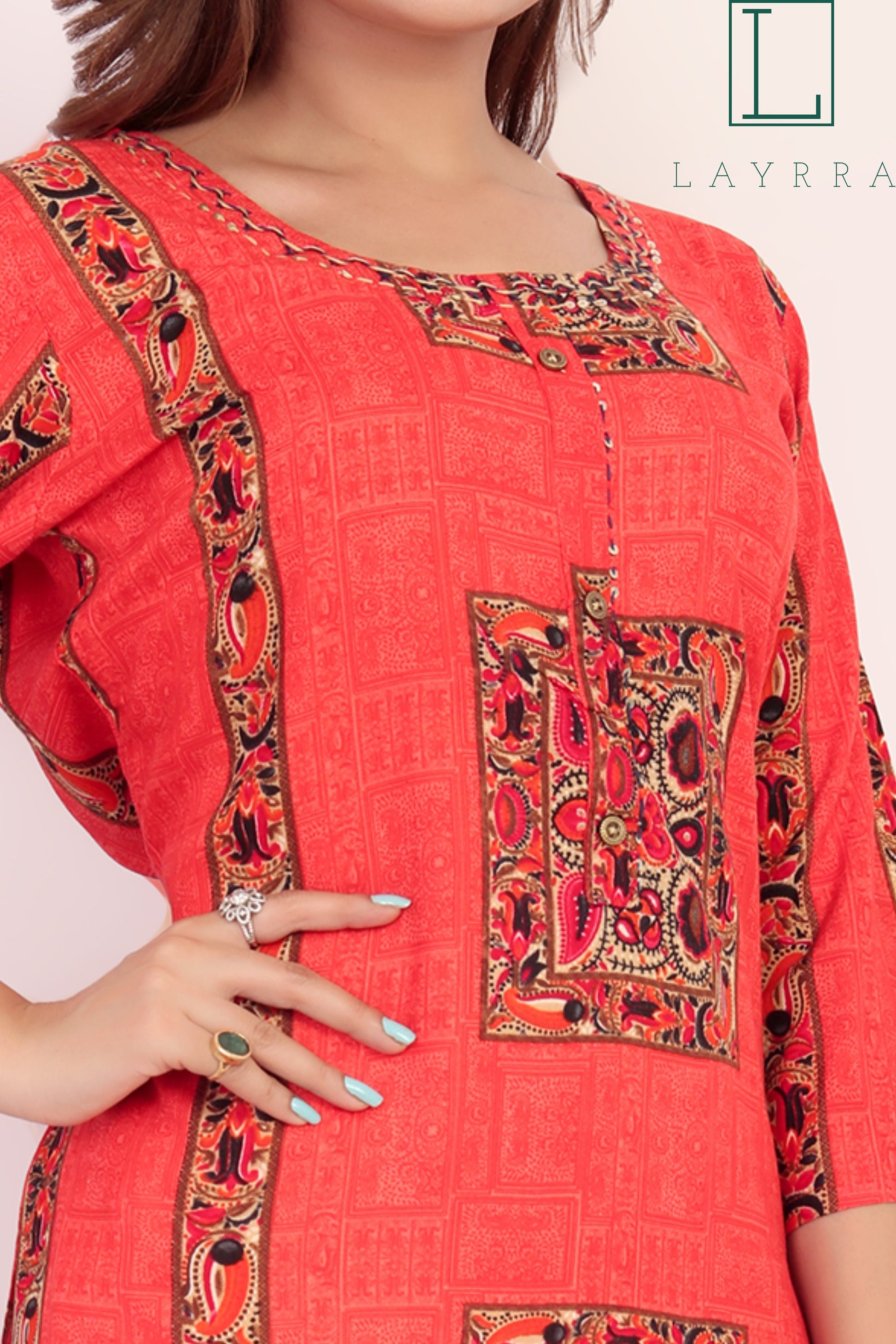 "Women Red Orange Ethnic Abstract Printed Kurta with Trousers, has a round neck, three-quarter sleeves