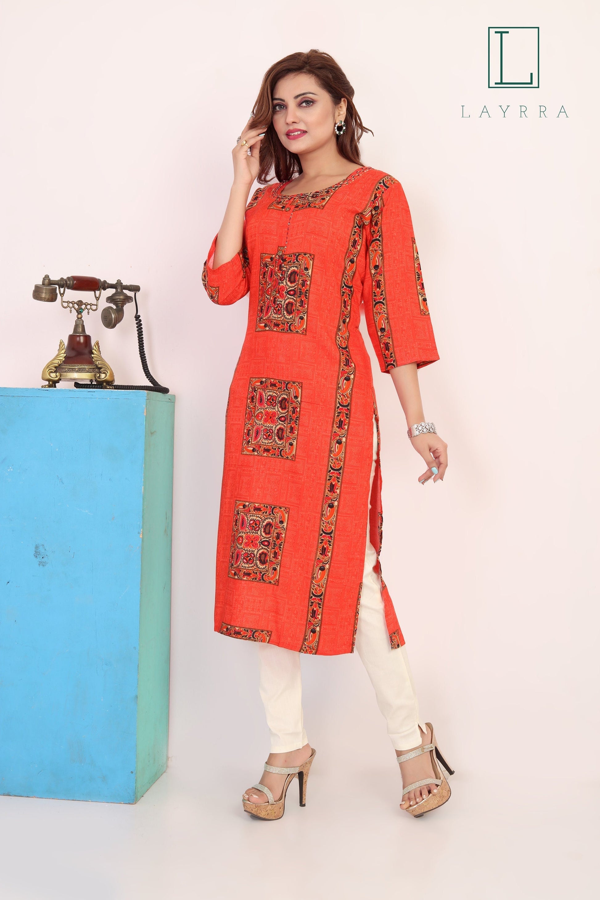 Package Contents: 1 x Red Orange Abstract Printed Kurta 1 x White Trousers (optional)