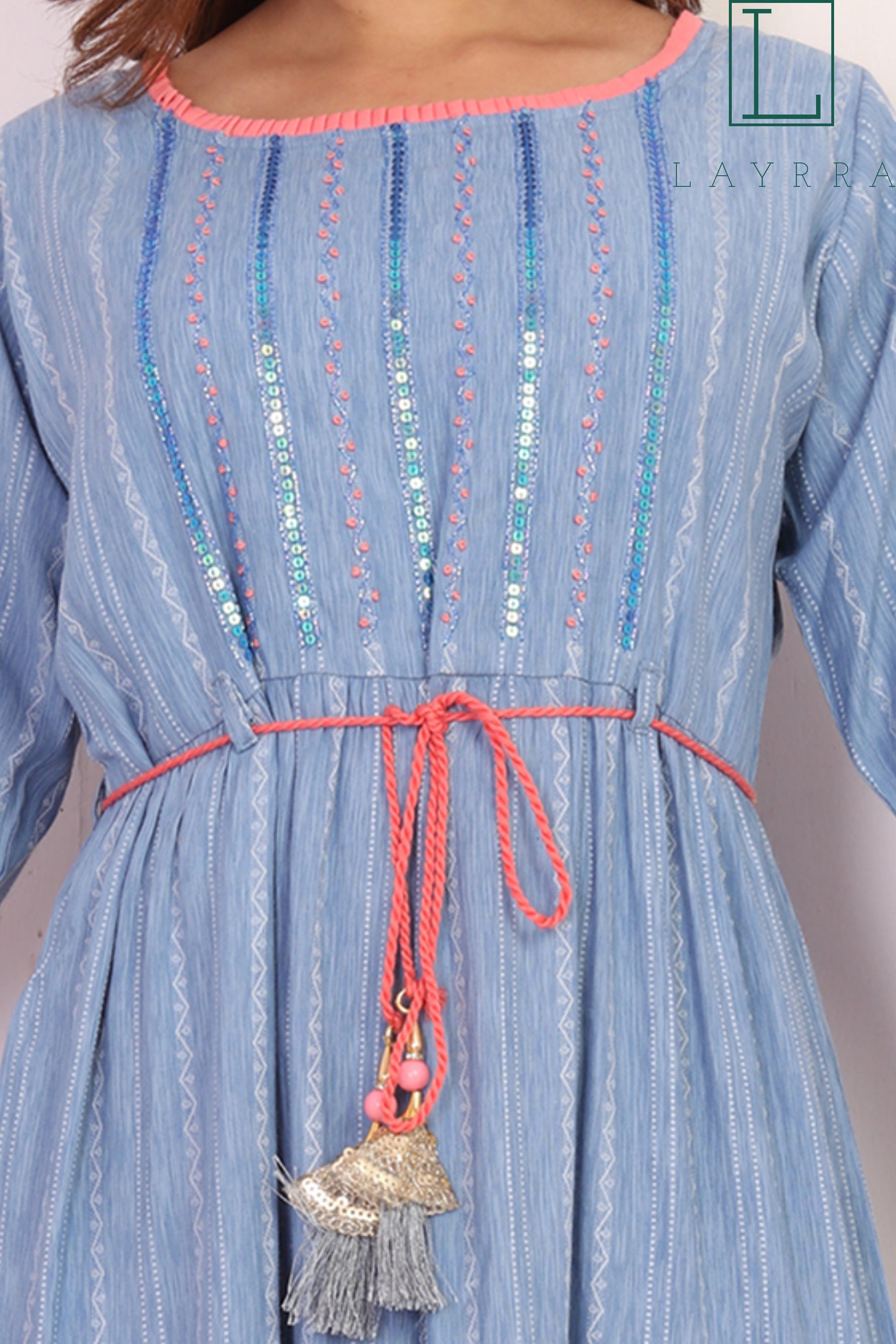 "Women Sky Blue Ethnic Sequinned Anarkali Kurta with Latkan - Complete Set, has a round neck, 7/8 flared sleeves