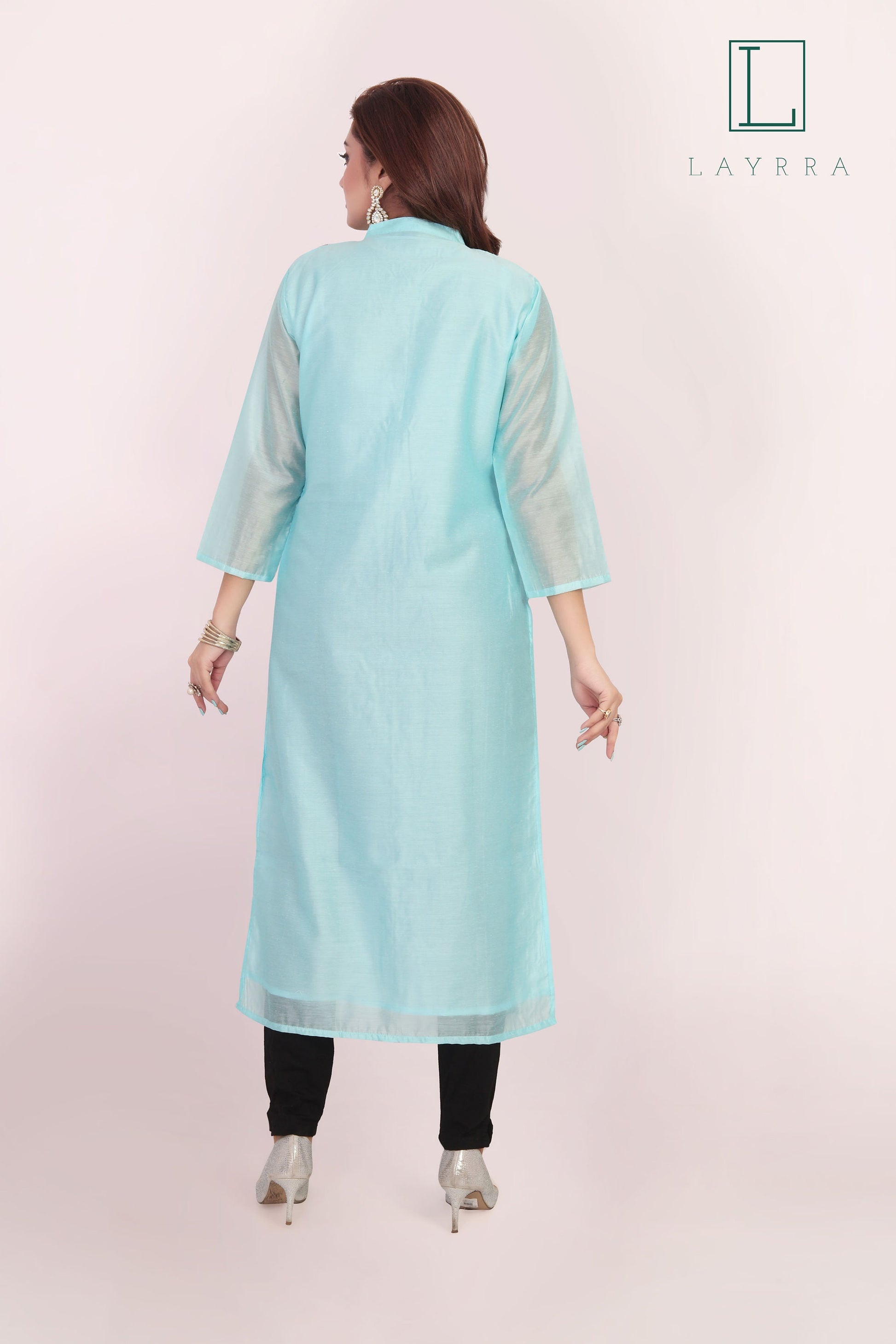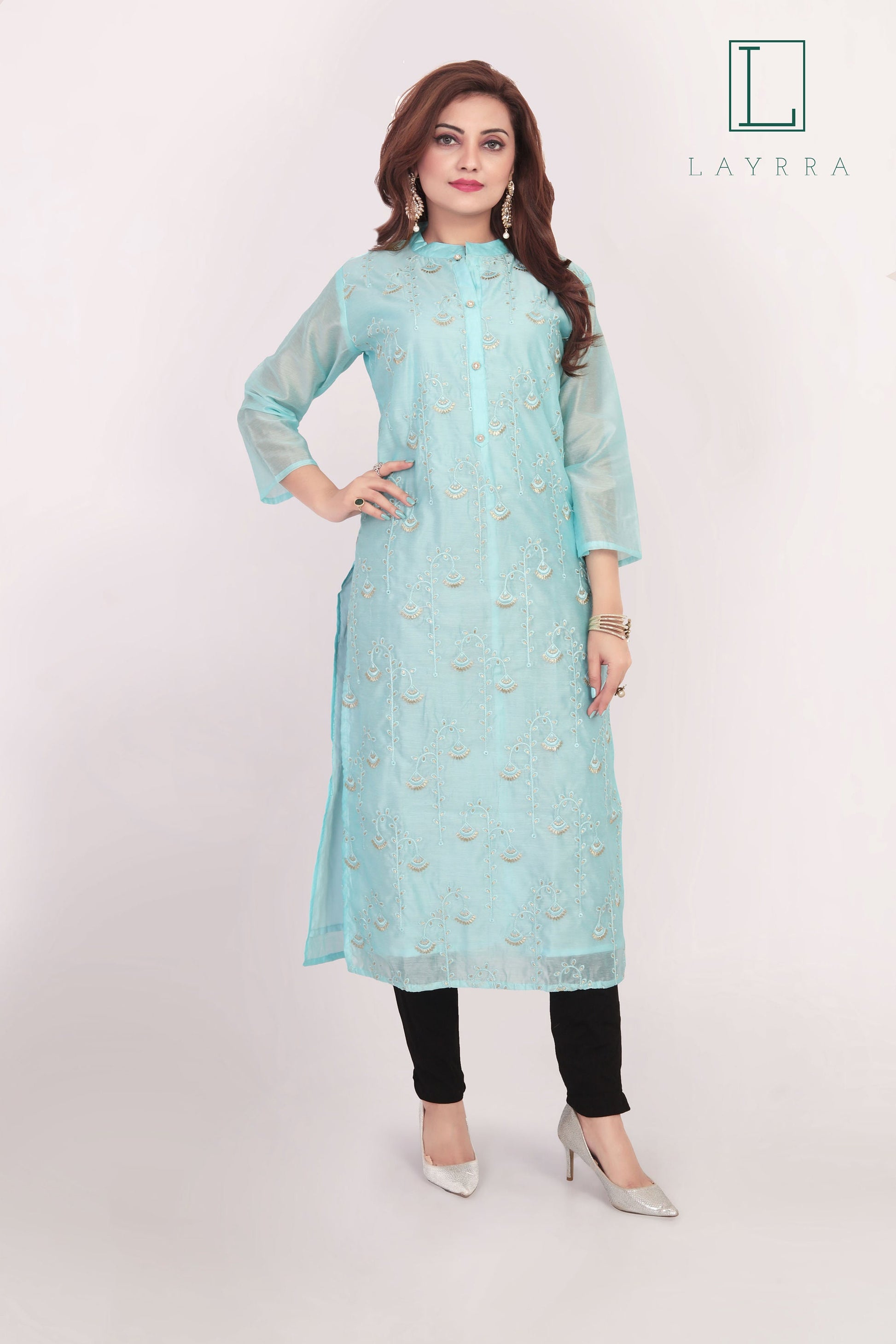Package Contents: 1 x Turquoise Embroidered Kurta 1 x Black Trousers (optional)
