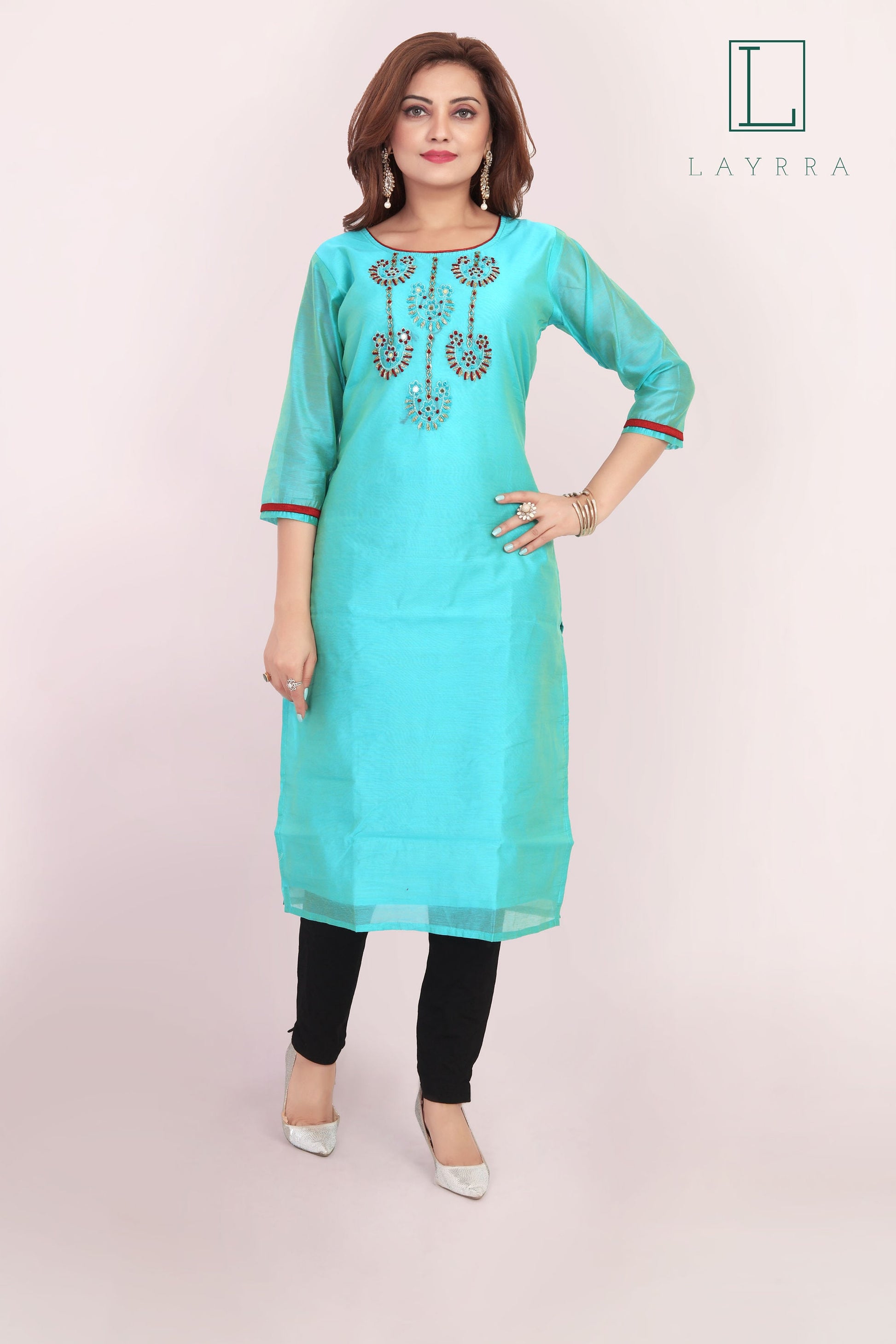 "Women Turquoise Ethnic Motifs Embroidered Mirror work Kurta with Trousers , has a round neck, three-quarter sleeves