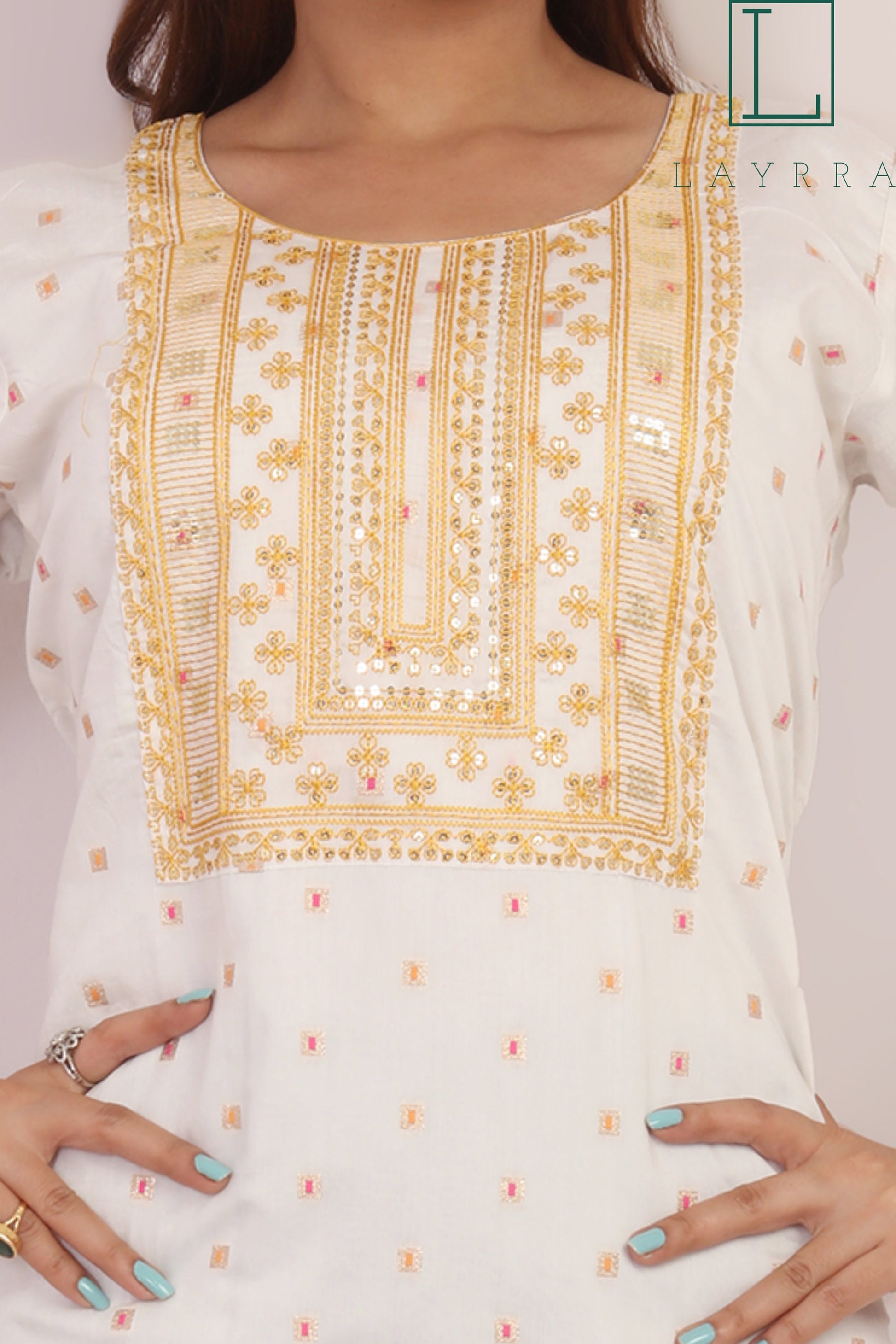 "Women White Yellow & Gold Motifs Sequinned Embroidered Kurta with Trousers , has a round neck, three-quarter sleeves