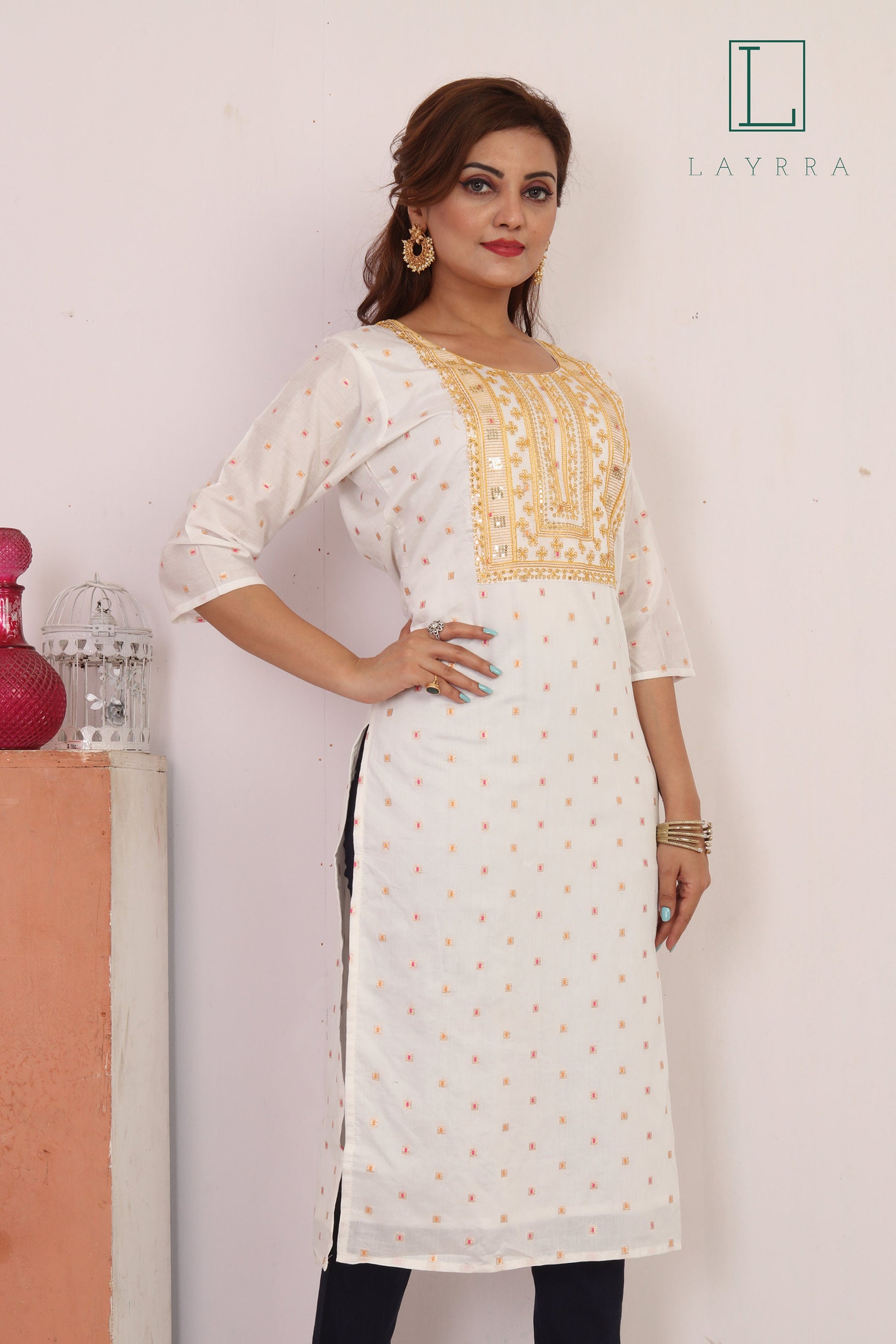 Package Contents: 1 x Women White Yellow & Gold Sequinned Embroidered Kurta 1 x Black Trousers (optional)
