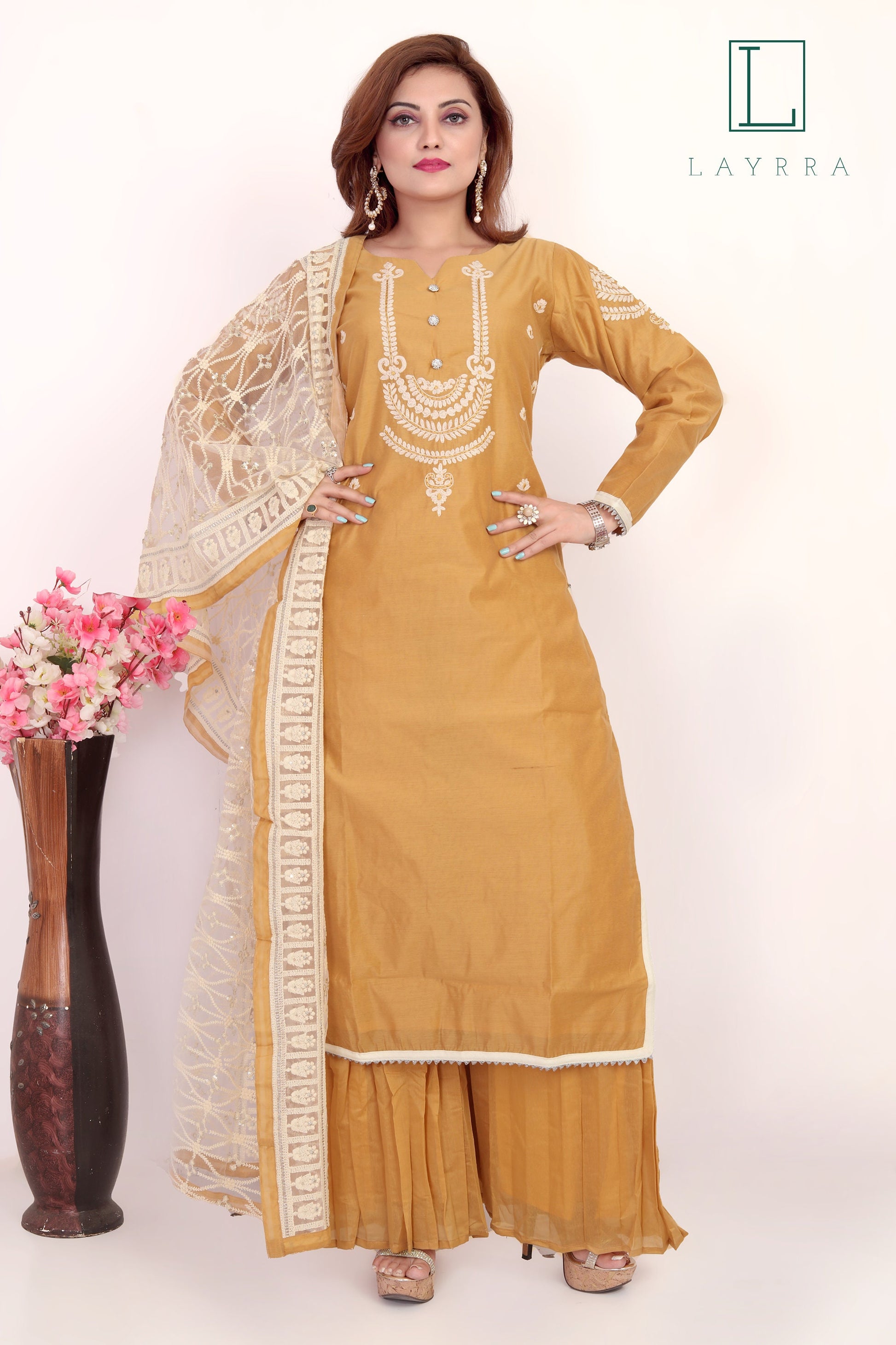 Package Contents: 1 x Women Yellow Brown Hand Embroidered Kurta with Palazzos & With Dupatta - Complete Set